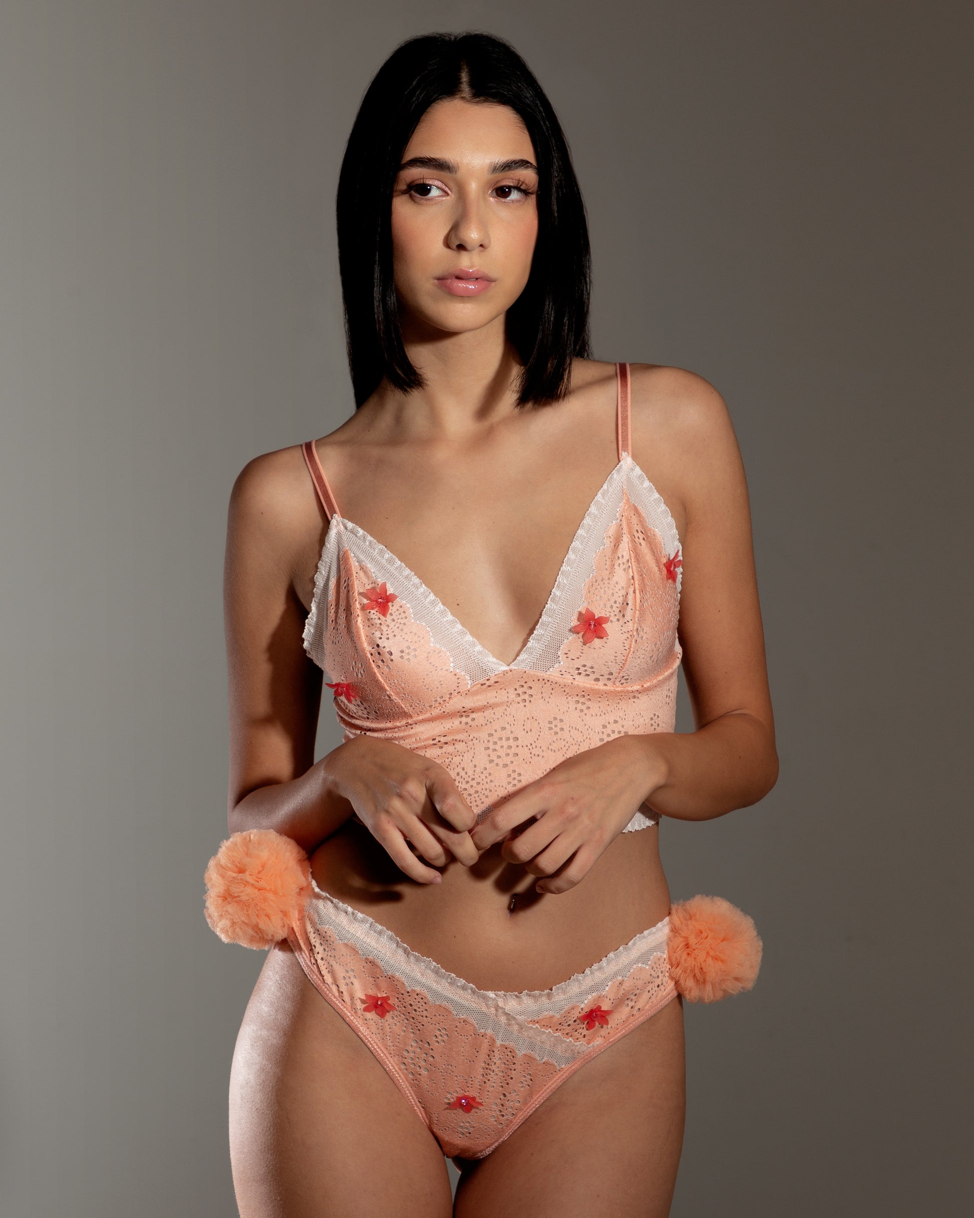 Inspired by the softness of sea sponges, the Gelso Brazilian Slip is a comfortable and playful piece that completes the Gelso tris. Adorned with vintage tri-dimensional floral embellishments and dead-stock Swarovski crystals and crafted from soft and stretch lace, the design features a frilled scallop while the body shines a peach toned hue.